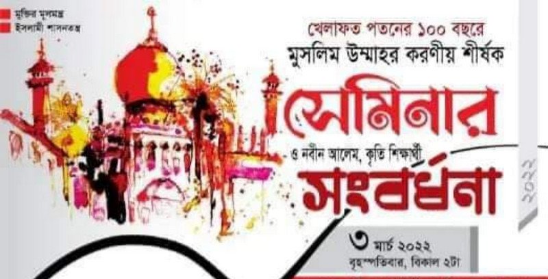 ইসলামী ছাত্র আন্দোলন বাংলাদেশ চট্টগ্রাম জেলা(পূর্ব) এর ব্যবস্থাপনায় আগামী বৃহস্পতিবার (০৩মার্চ) চট্টগ্রামের পটিয়া আদর্শ উচ্চ বিদ্যালয় মিলনায়তনে ‘খেলাফত পতনের ১০০ বছর : মুসলিম উম্মাহর করণীয়’ শীর্ষক সেমিনার ও নবীন আলেম, কৃতি শিক্ষার্থী সংবর্ধনা অনুষ্ঠিত হবে।