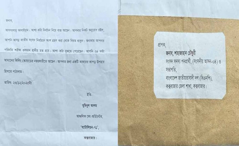 বিএনপির মনোনীত এ প্রার্থীকে উদ্দেশ করে চিঠিতে বলা হয়, ‘আসসালামু আলাইকুম। আশা করি, নির্বাচন নিয়ে ব্যস্ত আছেন। আপনার নিকট অনুরোধ রইল, আপনি আসন্ন জাতীয় সংসদ নির্বাচনে অংশ গ্রহণ করা থেকে বিরত থাকুন। অন্যথায়, আপনার পরিণতি শরীফ ওসমান হাদির মত হবে। আশা করি, বুঝতে পেরেছেন। আপনি ২৪ ঘণ্টা আমাদের কিলিং স্কোয়াডের নজরদারিতে আছেন। আপনার জন্য একটি কাফনের কাপড় উপহার হিসাবে পাঠালাম।’