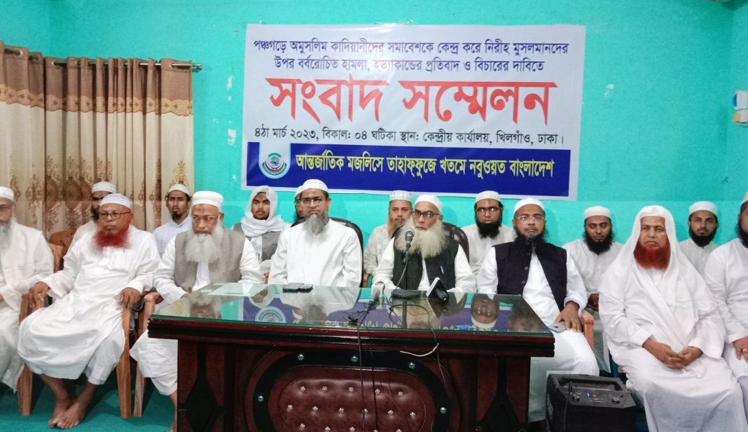 বক্তারা আরও বলেন, কাদিয়ানিরা অমুসলিম হওয়া সত্ত্বেও নিজেদের মুসলমান দাবি করে ধর্মপ্রাণ সাধারণ মুসলমানদের বিভ্রান্ত করে ঈমানহারা করছে। গতকাল শুক্রবার কাদিয়ানিরা অসাংবিধানিকভাবে মুসলমানদের পরিভাষা ব্যবহার করে তিন দিনব্যাপী সালানা জলসা করার উদ্যোগ নেয়। তাদের জলসা বন্ধ করার দাবিতে পঞ্চগড়ের সর্বস্তরের মুসলমানগণ স্বপ্রণোদিত হয়ে রাজপথে নেমে আসে। সেই ন্যায় সংগত প্রতিবাদী আন্দোলনে বিনা উস্কানিতে নিরীহ মুসলমানদের উপর আইনশৃঙ্খলা বাহিনী বর্বরোচিত হামলা চালায়। এতে আরিফুজ্জামান নামে একজন মুসলিম যুবক ঘটনাস্থলে শাহাদাত বরণ করে, আহত হয় শতাধিক। এদের মাঝে বেশ কয়েকজনের অবস্থা গুরুতর। প্রশাসনের এমন অহেতুক, অযাচিত হামলা ও গুলিবর্ষণের তীব্র নিন্দা ও প্রতিবাদ জানাচ্ছে আন্তর্জাতিক মজলিসে তাহাফফুজে খতমে নবুওয়ত বাংলাদেশ।