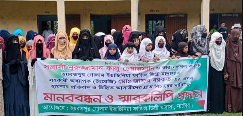 আজ বৃহস্পতিবার (৪ আগস্ট) মাদ্রাসার শিক্ষার্থীরা হামলার সাথে জড়িত সকলকে গ্রেফতারের দাবিতে মাদ্রাসা প্রাঙ্গনে মানববন্ধন করে।