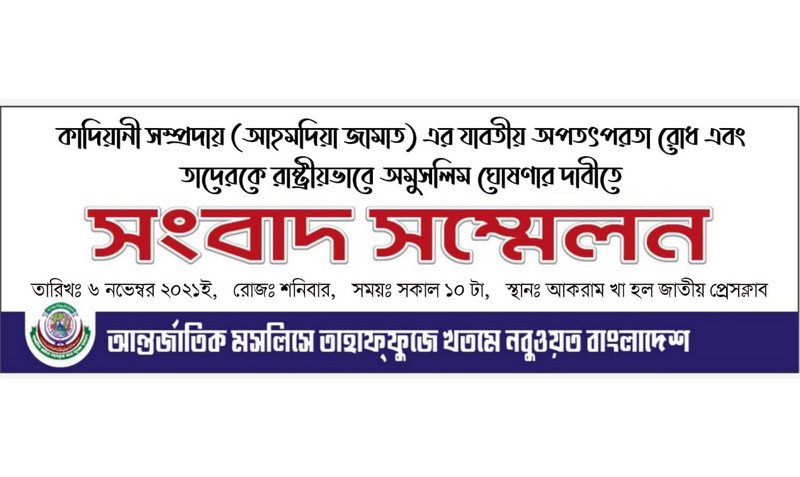 আগামী শনিবার কাদিয়ানীদের অমুসলিম ঘোষণার দাবিতে সংবাদ সম্মেলন