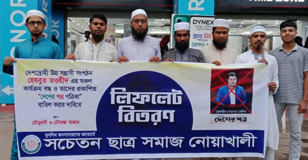 নোয়াখালীতে হেযবুত তওহীদের কার্যক্রম বন্ধ ও তাদের প্রকাশিত “দেশের পত্র” পত্রিকা বন্ধের দাবিতে লিফলেট বিতরণ করেছে নোয়াখালী সচেতন ছাত্র সমাজ।