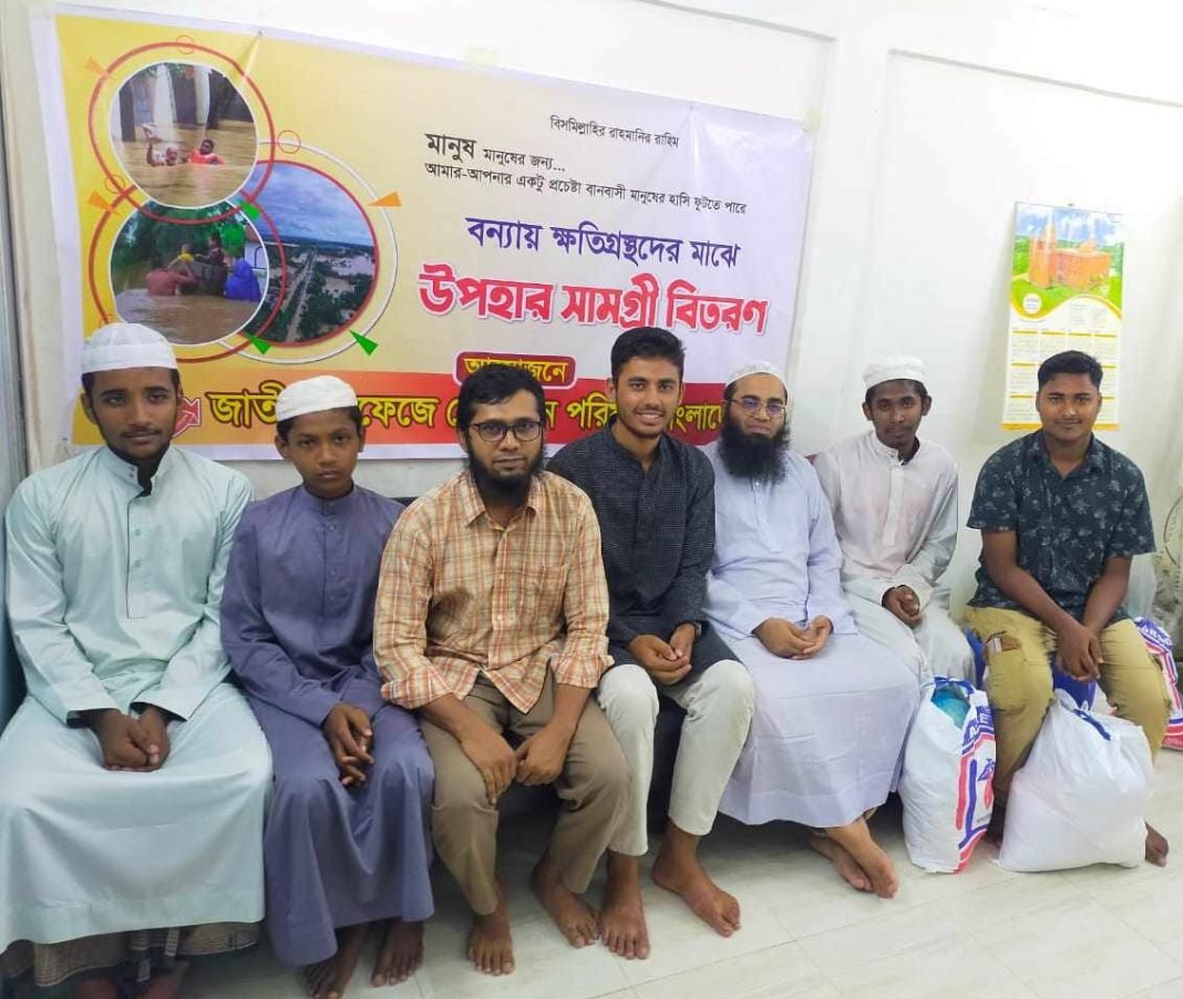 জাতীয় হাফেজে কোরআন পরিষদ বাংলাদেশ এর পক্ষে থেকে ফেনী জেলার ফুলগাজীতে বন্যায় ক্ষতিগ্রস্তদের মাঝে উপহার হিসেবে নিত্য প্রয়োজনীয় সামগ্রী বিতরণ করা হয়েছে।