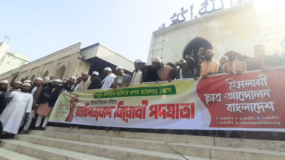 শহীদ ওসমান হাদির ওপর হামলার এক মাস পূর্ণ হলো আজ। এই উপলক্ষ্যে খুনিদের বিচার ও আধিপত্যবাদ প্রতিরোধের দাবিতে রাজধানীতে বিক্ষোভ সমাবেশ ও পদযাত্রা করেছে ইসলামী ছাত্র আন্দোলন বাংলাদেশ।