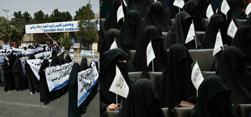 তালেবান সরকারের নীতির সমর্থনে বোরকা পড়ে সমাবেশ করেছেন আফগিস্তানের নারী। পা থেকে মাথা পর্যন্ত কালো বোরকায় নিজেদের দেহ আবৃত করে এবং কালেমা খচিত পতাকা হাতে নিয়ে সমাবেশে অংশ নেন তারা।