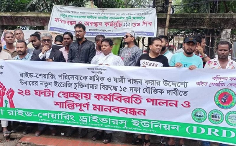 সর্বনিম্ন ১০০ টাকা ভাড়া নির্ধারণসহ ১৫ দফা দাবিতে ২৪ ঘণ্টার কর্মবিরতি পালন ও মানববন্ধন করেছে ঢাকা রাইড-শেয়ারিং ড্রাইভার্স ইউনিয়ন (ডিআরডিইউ)।