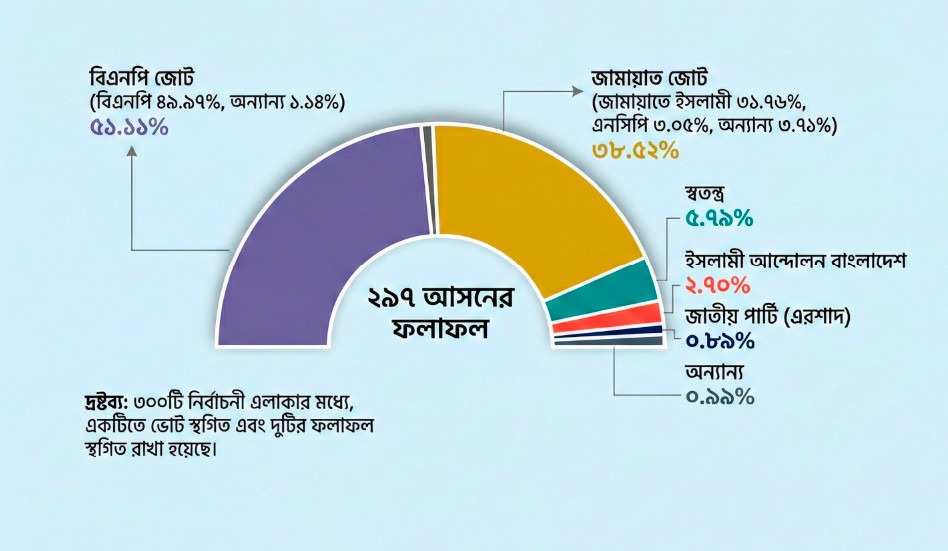এর মধ্যে জামায়াতে ইসলামী এককভাবে ৩১.৭৬ শতাংশ ভোট পেয়ে দ্বিতীয় বৃহত্তম দল হিসেবে আবির্ভূত হয়েছে। জোটের অন্য শরিকদের মধ্যে ‘শাপলা কলি’ প্রতীকে জাতীয় নাগরিক পার্টি (এনসিপি) ৩.০৫ শতাংশ, বাংলাদেশ খেলাফত মজলিস ২.০৯ শতাংশ এবং খেলাফত মজলিস ০.৭৬ শতাংশ ভোট পেয়েছে।