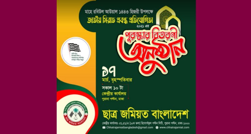 ছাত্র জমিয়ত বাংলাদেশ আয়োজিত জাতীয় সীরাত প্রবন্ধ প্রতিযোগিতা-২০২১ এর পুরষ্কার বিতরনীর আগামীকাল (১৭ মার্চ) বৃহস্পতিবার সকাল ১০ টায় পল্টনস্থ জমিয়তে উলামায়ে ইসলাম বাংলাদেশের কেন্দ্রীয় কার্যালয়ে অনুষ্ঠিত হবে। এ-র আগে (২৭ ফেব্রুয়ারী) এক সংবাদ বিজ্ঞপ্তিতে পুরষ্কার বিতরণীর তারিখ ও বিজয়ীদের নাম প্রকাশ করে ছাত্র জমিয়ত।