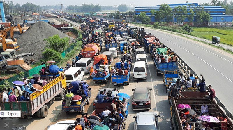 ঢাকা-টাঙ্গাইল-বঙ্গবন্ধু সেতু মহাসড়কে শুক্রবার (১৬ জুলাই) সকাল থেকে ঈদে ঘরমুখো যাত্রী ও যানবাহনের চাপ বেড়েছে। এতে করে বঙ্গবন্ধু সেতু পূর্বপাড় থেকে টাঙ্গাইলের কালিহাতী উপজেলার পৌলি পর্যন্ত ১৫ কিলোমিটার এলাকাজুড়ে থেমে থেমে যানজটের সৃষ্টি হয়েছে।অন্য দিকে ঢাকামুখী গরুবাহী ট্রাকের চাপ বাড়ছে।