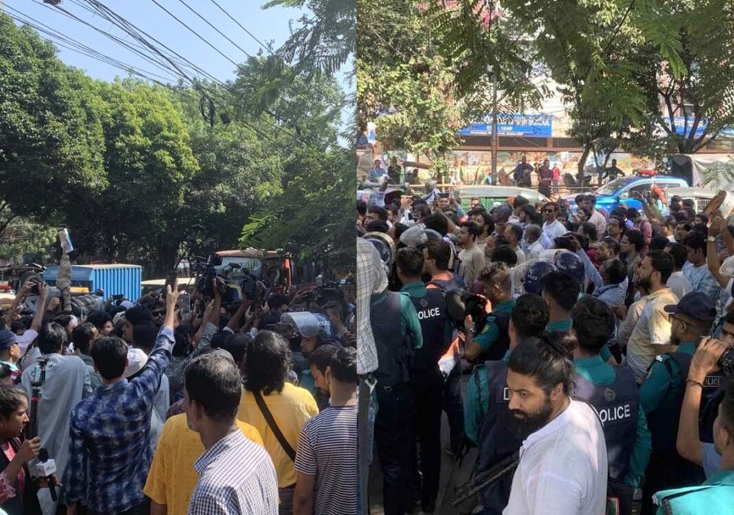 বুলডোজার নিয়ে ধানমন্ডি ৩২-এ গিয়ে পুলিশের বাধার মুখে পড়েছেন ঢাকা কলেজের শিক্ষার্থীরা। এসময় তারা ‘বাধা দিলে ধানমন্ডি ৩২ থাকবে না, ভাঙতে ভাঙতে ভাঙতে দে, মুজিববাদ মুর্দাবাদ’সহ নানা রকম স্লোগান দিতে থাকেন।