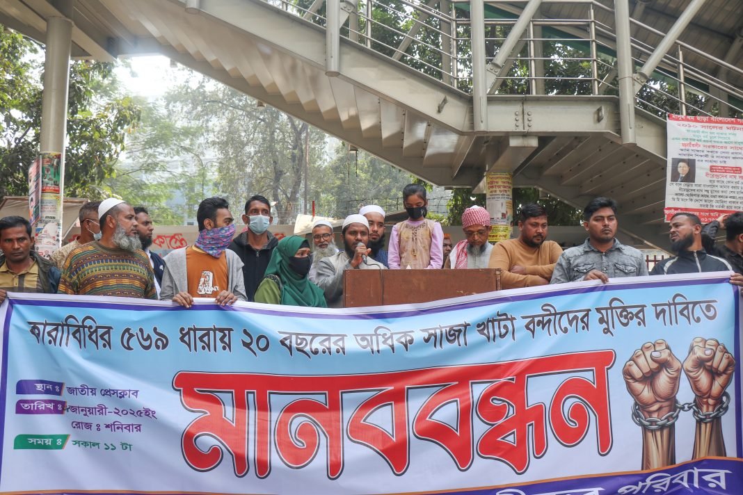 কারাবিধির ৫৬৯ ধারায় ২০ বছরের অধিক সাজা খাটা বন্দীদের মুক্তির দাবিতে মানববন্ধন করেছে ভুক্তোভোগী পরিবারের সদস্যরা।