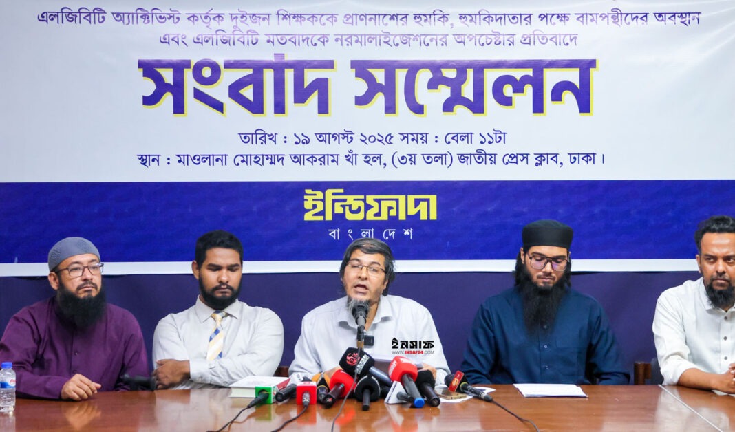 এলজিবিটি অ্যাক্টিভিস্ট কর্তৃক দুইজন বিশ্ববিদ্যালয় শিক্ষক ড. মোহাম্মাদ সরোয়ার এবং আসিফ মাহতাব উৎসকে হত্যার হুমকি ও হুমকিদাতার পক্ষে বামপন্থীদের অবস্থান এবং এলজিবিটি নরমালাইজেশনের অপচেষ্টার প্রতিবাদে সংবাদ সম্মেলন করেছে ইন্তিফাদা বাংলাদেশ।