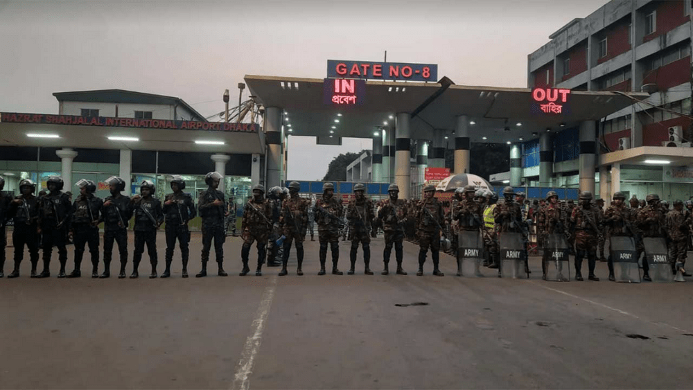 শুক্রবার (১৯ ডিসেম্বর) বিকেল পাঁচটায় হযরত শাহজালাল আন্তর্জাতিক বিমানবন্দরে দেখা যায়, প্রধান সড়ক থেকে ডোমেস্টিক ও আন্তর্জাতিক টার্মিনালের প্রতিটি প্রবেশ মুখে সেনাবাহিনীর সদস্যরা দায়িত্ব পালন করছেন। এছাড়া পুরো বিমানবন্দর এলাকার প্রতিটি রাস্তায় তাদের দায়িত্ব পালন করতে দেখা যায়। এছাড়া ভিআইপি গেটে বাংলাদেশ বিমান বাহিনী ও আর্মড ফোর্স ব্যাটালিয়নের সদস্যদের কঠোর দায়িত্ব পালন করতে দেখা যায়।