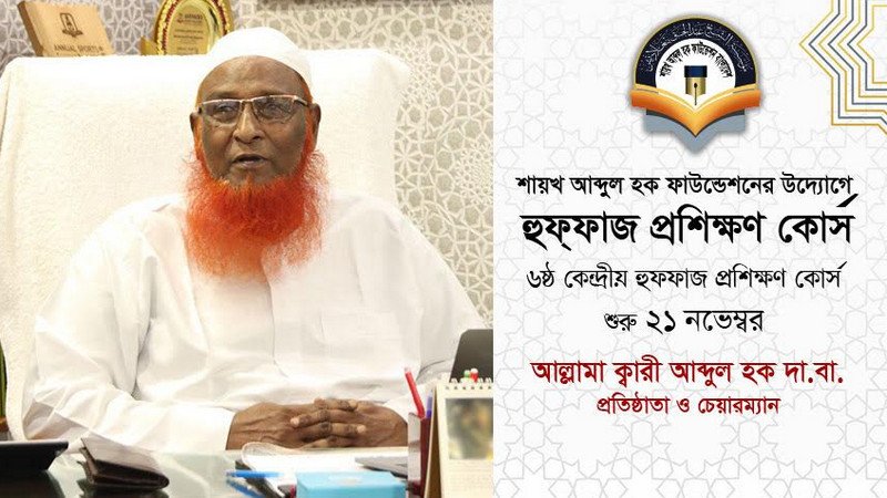উস্তাযুল হুফ্ফাজ শায়খ ক্বারী আব্দুল হক প্রতিষ্ঠিত ও পরিচালিত “শায়খ আব্দুল হক ফাউন্ডেশন বাংলাদেশ”-এর উদ্যোগে ৩১ দিনব্যাপী কেন্দ্রীয় হুফ্ফাজ প্রশিক্ষণ কোর্স শুরু হতে যাচ্ছে ২১ নভেম্বর থেকে। কোর্সটি শেষ হবে ২২ ডিসেম্বর।
