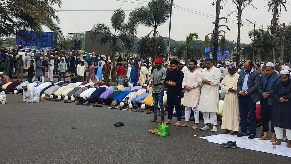 শনিবার (২০ ডিসেম্বর) দুপুর দেড়টার দিকে জানাজা শুরুর আগেই সংসদ ভবনের আশপাশের সড়ক, ফুটপাত ও খোলা জায়গা কানায় কানায় পূর্ণ হয়ে যায়। জনসমাগমের কারণে মুসল্লিদের একটি বড় অংশ সড়কের ওপরই কাতারবন্দি হয়ে জোহরের নামাজ আদায় করেন।