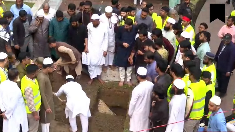 জুলাই গণ অভ্যুত্থানের সম্মুখভাগের যোদ্ধা এবং ইনকিলাব মঞ্চের মুখপাত্র শহীদ শরিফ ওসমান হাদির কবরে মাটি দেওয়া হচ্ছে।