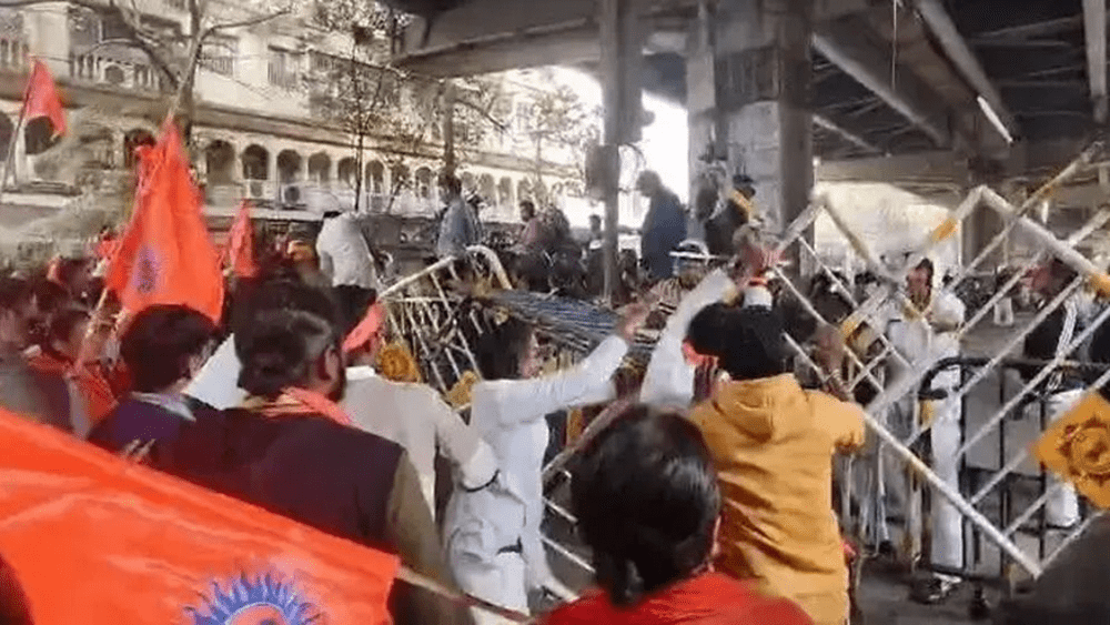সংবাদমাধ্যমগুলোর শেয়ার করা ভিডিওতে দেখা গেছে, একদল লোক গেরুয়া রঙের পতাকা হাতে উত্তেজিত হয়ে ব্যারিকেড ভাঙার চেষ্টা করছে। এর আগের দিন সোমবার পশ্চিমবঙ্গ বিজেপির নেতা শুভেন্দু অধিকারীর নেতৃত্বে বাংলাদেশবিরোধী বিক্ষোভ অনুষ্ঠিত হয়।