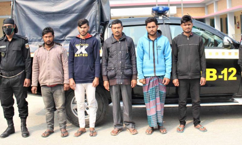 গ্রেপ্তাররা হলেন- ভেড়ামারা উপজেলার চন্ডিপুর গ্রামের মৃত সোনা মালিথার ছেলে মিন্টু মালিথা (২৮), চাঁদপুর গ্রামের নজরুল মালিথার ছেলে রনি মালিথা (২৮), একই গ্রামের আব্দুল হামিদ ওরফে কটার দুই ছেলে জনি (২৮) ও ড্যানি (২৫) এবং একই গ্রামের মৃত জফো প্রামানিকের ছেলে জারমান প্রামানিক (৪০)।