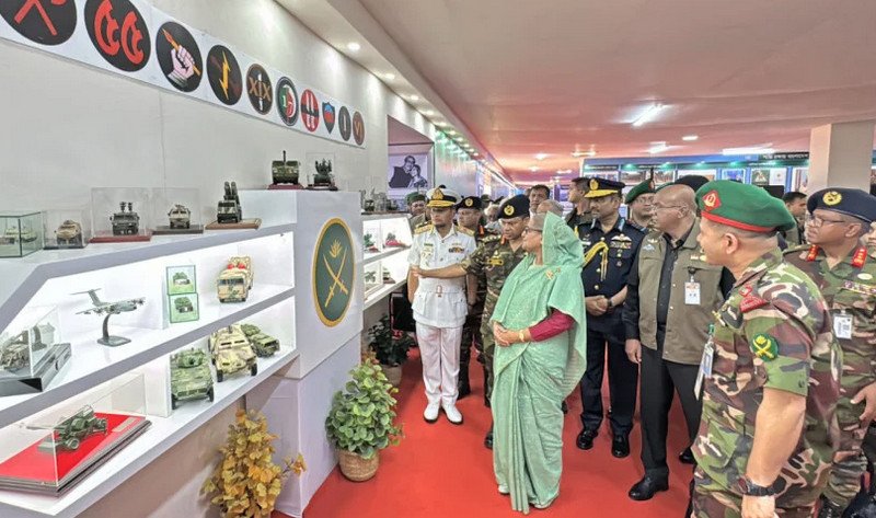 শেখ হাসিনা তিন বাহিনীর বিভিন্ন স্টল ও প্যাভিলিয়ন ঘুরে দেখেন এবং সংশ্লিষ্ট কর্মকর্তারা সমরাস্ত্র সম্পর্কে তাকে ব্রিফ করার সময় সেনা, নৌ ও বিমান বাহিনীর সৈন্যদের ব্যবহৃত বিভিন্ন হালকা ও ভারী অস্ত্র প্রত্যক্ষ করেন।