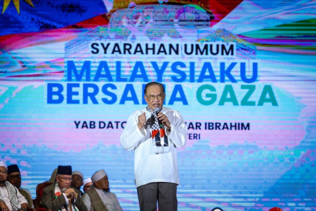 সাদা পোশাক পরা এবং ঐতিহ্যবাহী কেফিয়াহ স্কার্ফ পরে, নারী-পুরুষ ও শিশুরা গাজ্জার সমর্থনে একত্রিত হন, যেখানে প্রধানমন্ত্রী আনোয়ার ইবরাহীম গাজ্জা উপত্যকার যুদ্ধবিধ্বস্ত জনগণের জন্য আরও সহায়তার ঘোষণা দেন।