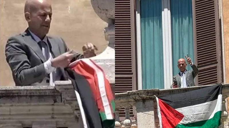 ইতালির পার্লামেন্টে ফিলিস্তিনের পতাকা উড়ালেন দেশটির সাবেক এমপি স্টেফানো আপুজ্জো।