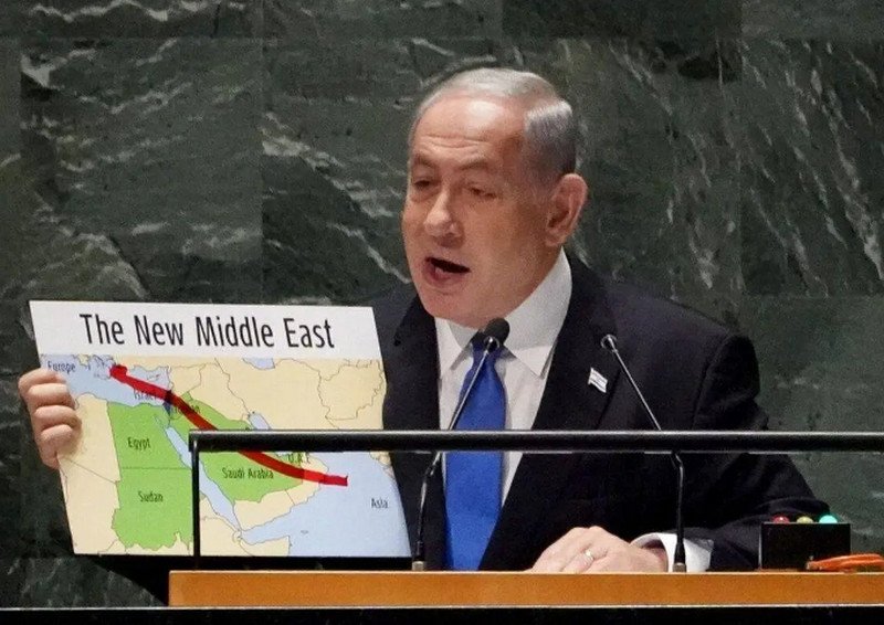গত শুক্রবার, সাধারণ পরিষদে মধ্যপ্রাচ্যের একটি নতুন মানচিত্র উপস্থাপন করেন ইসরাইলের ইতিহাসের সবচেয়ে কট্টর ও উগ্রবাদী সরকারের প্রধানমন্ত্রী নেতানিয়াহু। উপস্থাপিত মানচিত্রে দেখা যায় দখলকৃত পশ্চিম তীর, পূর্ব জেরুসালেম ও গাজা উপত্যকা বাদ দেওয়া হয়েছে।