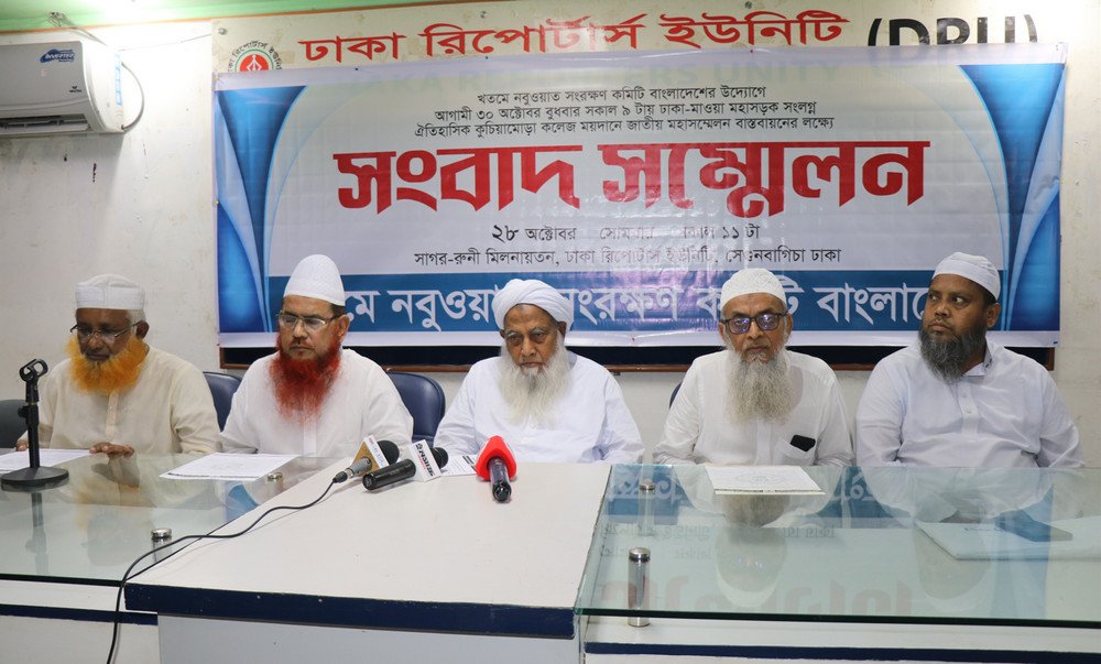 খতমে নবুওয়াত সংরক্ষণ কমিটি বাংলাদেশের উদ্যোগে আয়োজিত কাদিয়ানীদের অমুসলিম ঘোষণার দাবিতে আগামী বুধবার (৩০ অক্টোবর) ঢাকা-মাওয়া মহাসড়ক সংলগ্ন ঐতিহাসিক কুচিয়ামোড়া কলেজ ময়দানে জাতীয় মহাসম্মেলন বাস্তবায়নের লক্ষ্যে সংবাদ সম্মেলন করেছেন সংঠনটির আমীর মধুপুর পীর আল্লামা আব্দুল হামিদ ।