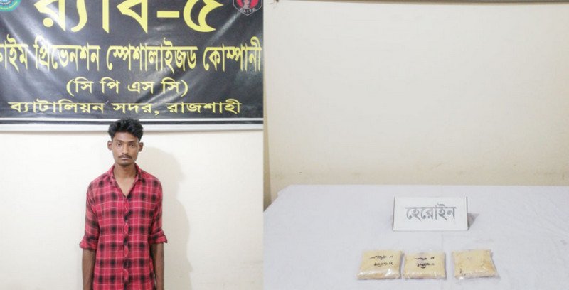 রাজশাহীর পুঠিয়ায় প্রায় ৬০ লাখ টাকা মূল্যের ৬০০ গ্রাম হেরোইনসহ মুহাম্মাদ হৃদয় (২২) নামের এক যুবককে আটক করেছে র্যাব। সে সিংড়া উপজেলার চাঁদপুরের মৃত আবুল কালাম আজাদের ছেলে।